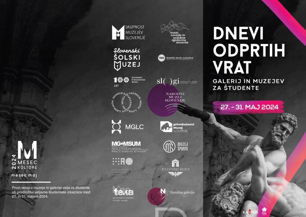 V sodelovanju ŠOU v Ljubljani z ljubljanskimi muzeji in galerijami konec maja potekajo dnevi odprtih vrat galerij in muzejev za študente. Študentke in študenti, še posebej lepo vabljeni med 27. in 31. majem 2024 na stalno razstavo SLOGI – Gledališkega muzeja, kjer se podate na HOJO ZA GLEDalIŠČEM. Od jezuitov do Cankarja!