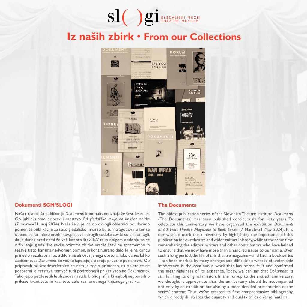 Naša najstarejša publikacija Dokumenti kontinuirano izhaja že šestdeset let. Ob jubileju smo pripravili razstavo Od gledališke revije do knjižne zbirke (7. marec–31. maj 2024). Naša želja je, da ob okrogli obletnici poudarimo pomen te publikacije za našo gledališko in širšo kulturno zgodovino ter se obenem spomnimo urednikov, piscev in drugih sodelavcev, ki so pripomogli, da je danes pred nami že več kot sto številk. V tako dolgem obdobju so se v življenju gledališke revije oziroma zbirke vrstile številne spremembe in težave: tisto, kar ima nedvomen pomen, je kontinuirano delo, ki je na koncu prineslo rezultate in potrdilo smiselnost njenega obstoja. Tako danes lahko zapišemo, da Dokumenti še vedno izpolnjujejo svoje prvotno poslanstvo. Ob pripravah na šestdesetletnico se nam je zdelo primerno, da obletnice ne pospremi le razstava, temveč tudi podrobnejši prikaz vsebine Dokumentov. Tako je po petdesetih letih znova nastala bibliografija, ki najbolj neposredno prikaže kvantiteto in kvaliteto zelo raznorodnega knjižnega gradiva.