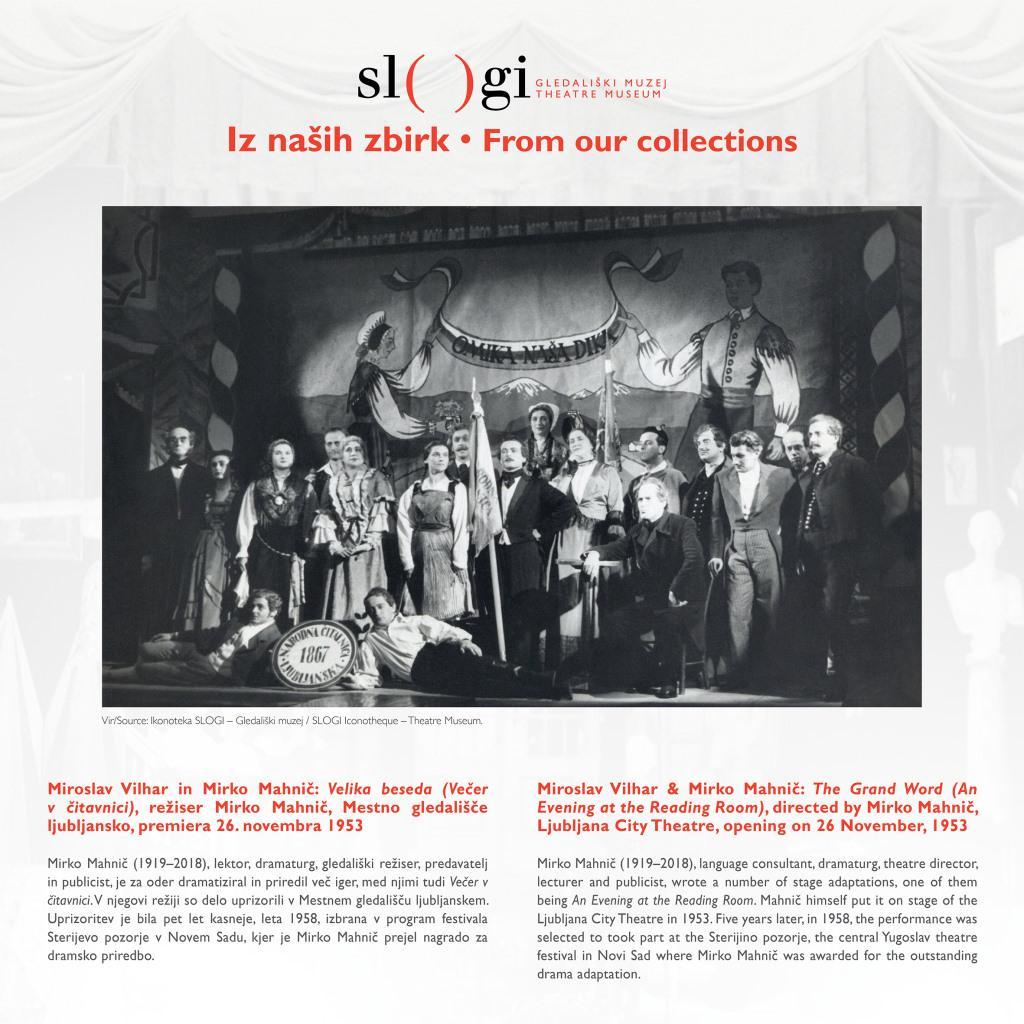 Predstavljamo vam zbirke SLOGI – Gledališkega muzeja. Decembra 2019 objavljamo fotografijo Velike besede (Večera v čitavnici) (Miroslav Vilhar in Mirko Mahnič, režiser Mirko Mahnič, Mestno gledališče ljubljansko, premiera 26. novembra 1953).