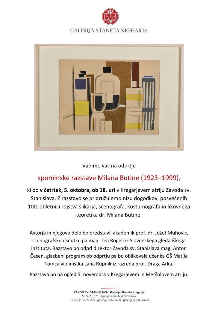 V četrtek, 5. oktobra, ob 18. uri v Kregarjevem atriju Zavoda Sv. Stanislava bo odprtje razstave Spominska razstava Milana Butine (1923–1999), kjer bo na ogled tudi nekaj del iz zbirke Slovenskega gledališkega inštituta. Več o razstavi >>