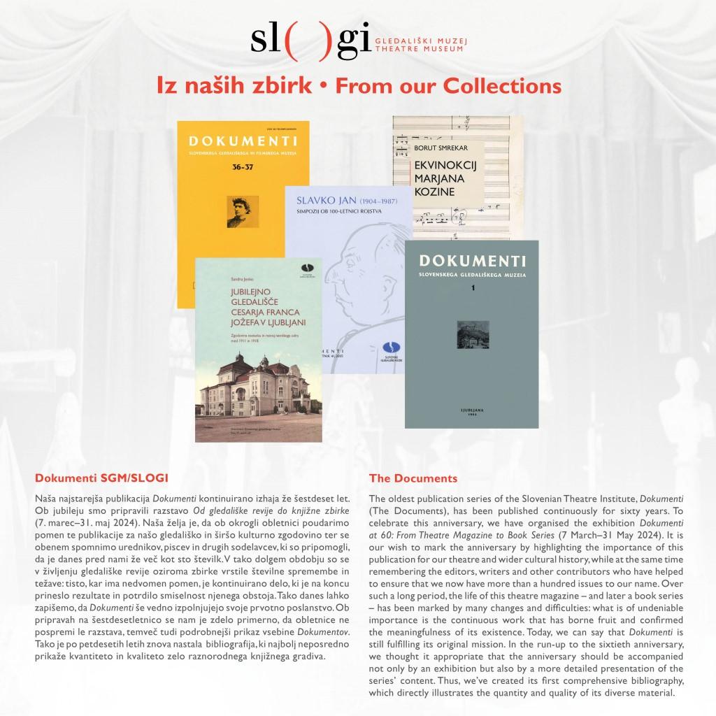 Our oldest publication series, Dokumenti (The Documents), has been published continuously for sixty years. To celebrate this anniversary, we have organised the exhibition Dokumenti at 60: From Theatre Magazine to Book Series (7 March–31 May 2024). It is our wish to mark the anniversary by highlighting the importance of this publication for our theatre and wider cultural history, while at the same time remembering the editors, writers and other contributors who have helped to ensure that we now have more than a hundred issues to our name. Over such a long period, the life of this theatre magazine – and later a book series – has been marked by many changes and difficulties: what is of undeniable importance is the continuous work that has borne fruit and confirmed the meaningfulness of its existence. Today, we can say that Dokumenti is still fulfilling its original mission. In the run-up to the sixtieth anniversary, we thought it appropriate that the anniversary should be accompanied not only by an exhibition but also by a more detailed presentation of the series’ content. Thus, we’ve created its first comprehensive bibliography, which directly illustrates the quantity and quality of its diverse material.