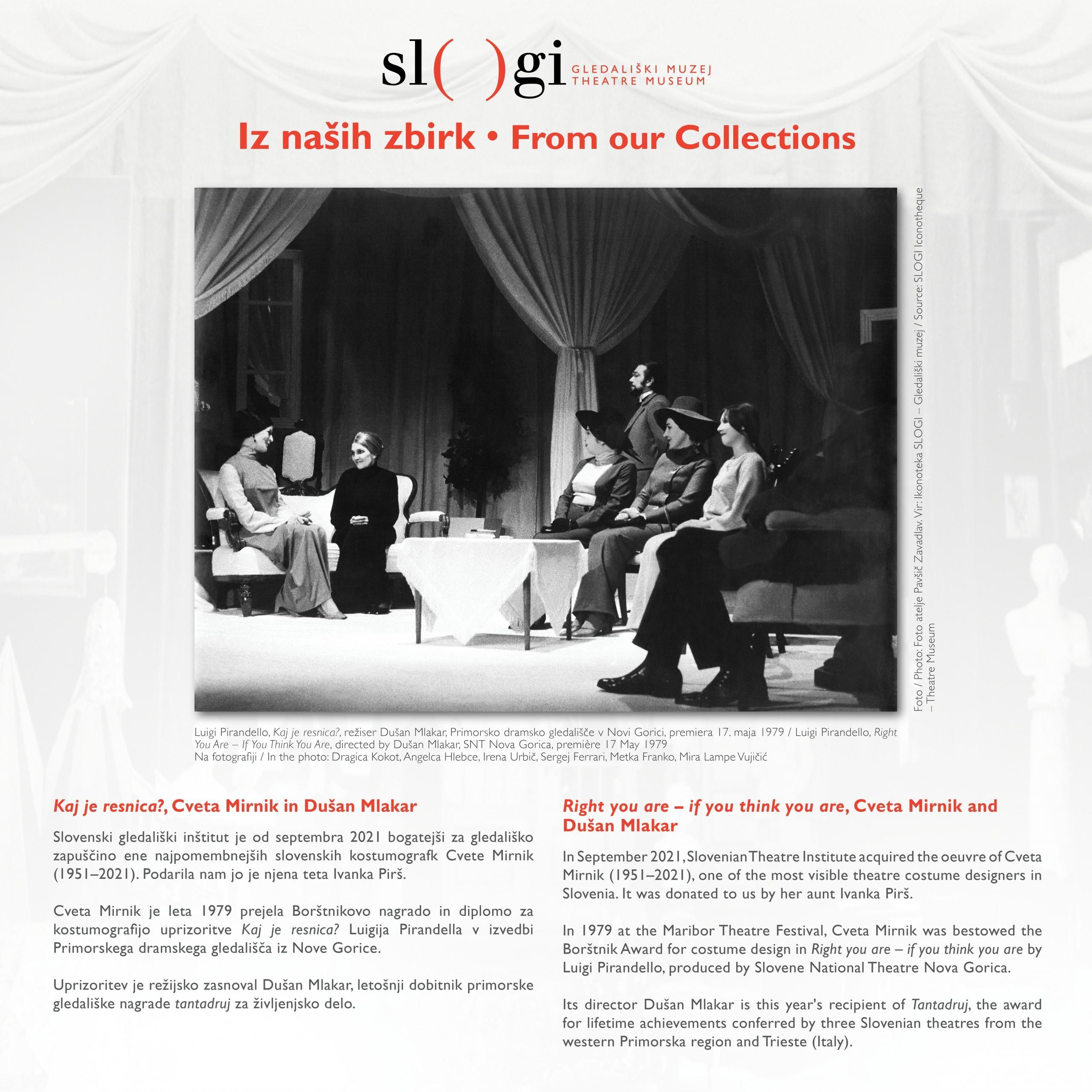 In 1979 at the Maribor Theatre Festival, Cveta Mirnik was bestowed the Borštnik Award for costume design in Right you are – if you think you are by Luigi Pirandello, produced by Slovene National Theatre Nova Gorica.