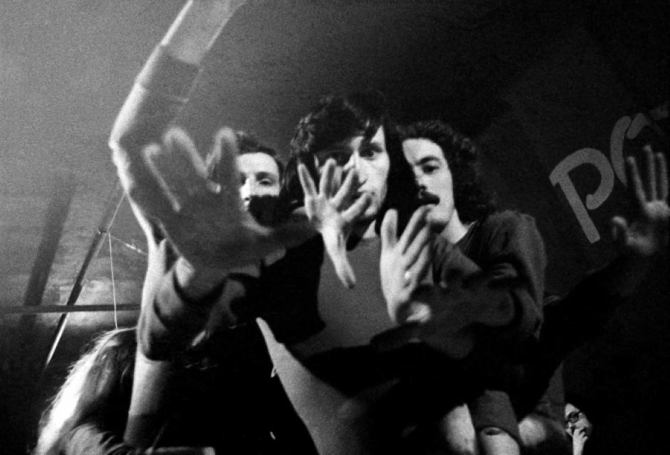 Janez Vrečko, Samo Gabrijelčič in Zdenko Kodrič v: Dane Zajc, Potohodec, r. Lado Kralj, Gledališče Pekarna, 1972. Foto: Tone Stojko. Vir: Ikonoteka SLOGI – Gledališki muzej.
