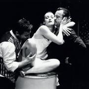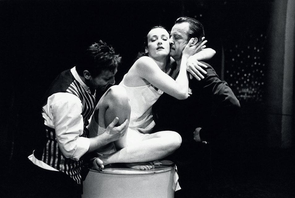 Gregor Strniša: Samorog, režiserka Meta Hočevar, SNG Drama Ljubljana, premiera 2. 10. 1992. Na fotografiji: Bojan Emeršič (Pincus), Saša Pavček (Uršula) in Andrej Nahtigal (Rabelj). Foto: Tone Stojko. Vir: Arhiv SNG Drama Ljubljana/Ikonoteka SLOGI – Gledališki muzej.