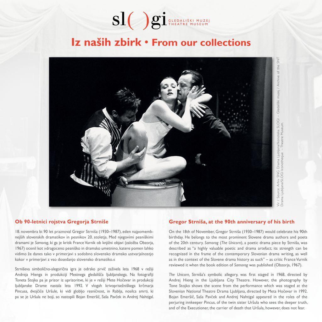 Predstavljamo vam zbirke SLOGI – Gledališkega muzeja. Novembra 2020, v obeležju nedavne 90-letnice rojstva Gregorja Strniše, predstavljamo fotografijo z uprizoritve Samoroga Gregorja Strniše v režiji Mete Hočevar (SNG Drama Ljubljana, premiera 2. 10. 1992).