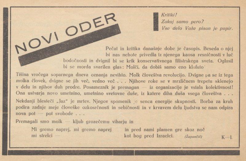 Prva stran revije Novi oder (1. številka, 1925 – izšla je le ena številka), ki jo je izdal gledališki ustvarjalec, reformator in režiser Ferdo Delak (1905-1968).