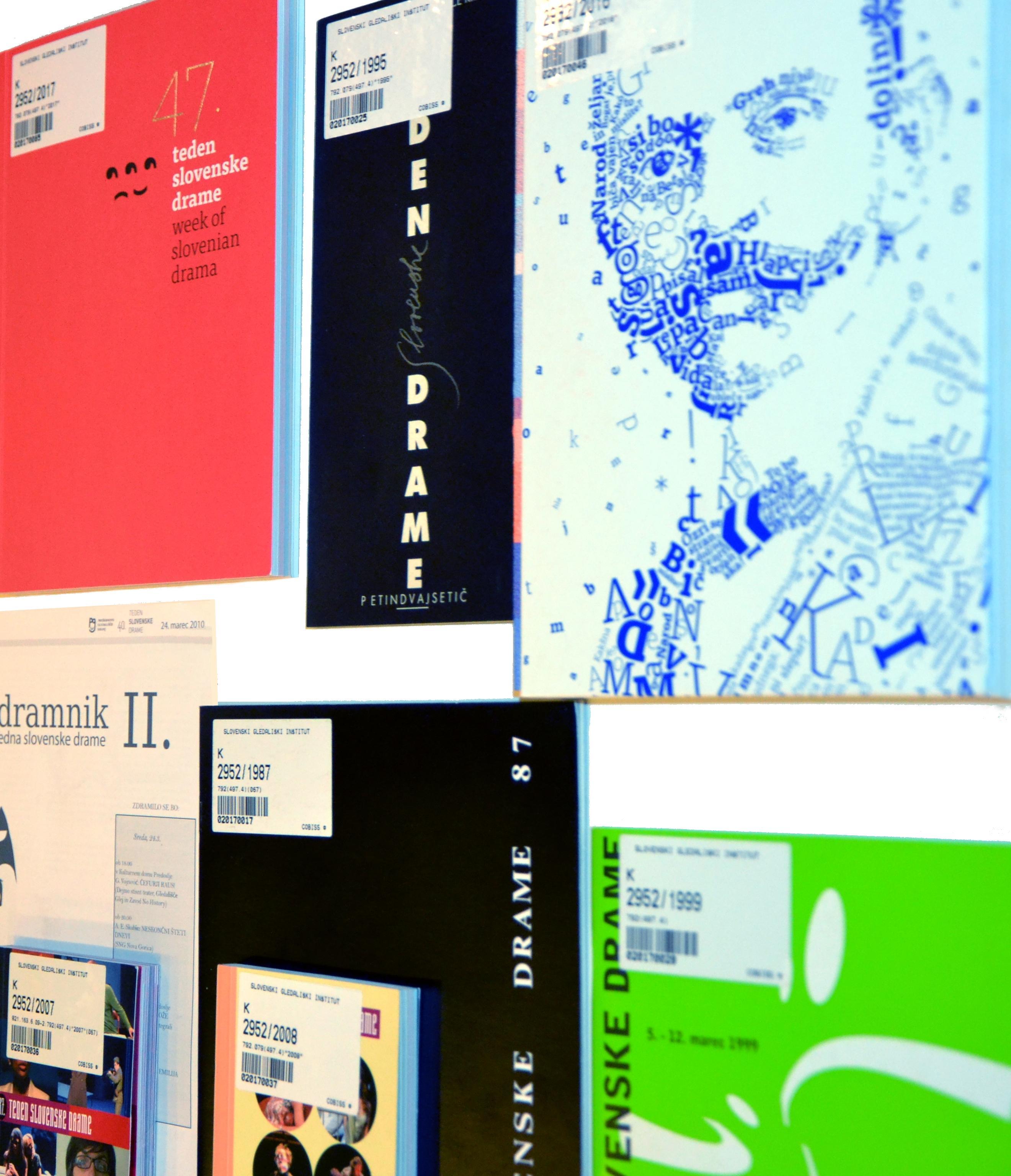 Ob 47. tednu slovenske drame v Kranju razstavljamo izbor katalogov in drugega gradiva, ki smo ga v knjižnici zbrali v skoraj petih desetletjih slovenskega gledališkega festivala, ki vzpodbuja in se posveča slovenskemu dramskemu ustvarjanju in njegovim ugledališčenjem. Programske knjižice so dolgo izhajale kot posamezne številke gledališkega lista Prešernovega gledališča in so spreminjale svojo zunanjo podobo ter obseg skladno z oblikovnimi spremembami te publikacije. V zadnjem času katalogi izhajajo kot samostojne publikacije, ki so – tako kot festivalski program – obsežnejše in vsebinsko bogatejše.